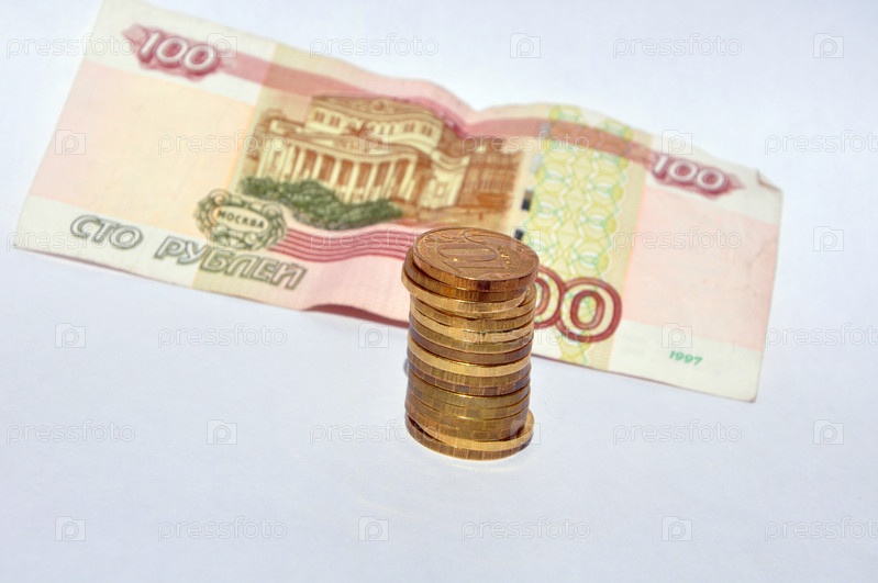 Купюра 100 рублей и стопка монет на голубом фоне
