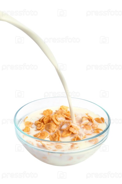 Струя молока льется в миску с кукурузными хлопьями на белом фоне