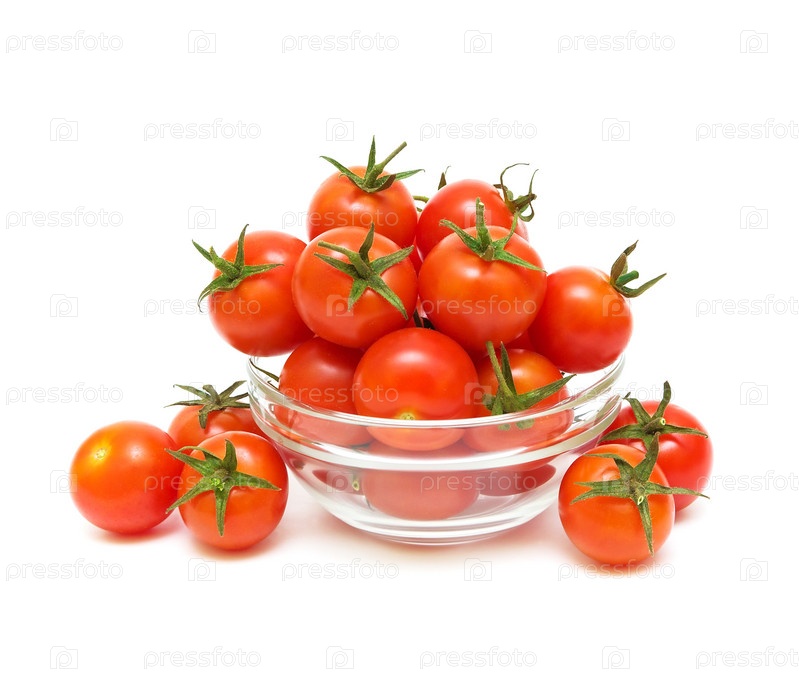 Спелые помидоры черри в стеклянной миске на белом фоне крупным планом