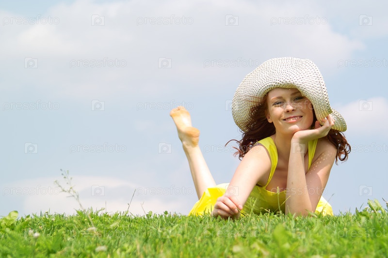 Красивая девушка в желтом платье и шляпе наслаждается летом