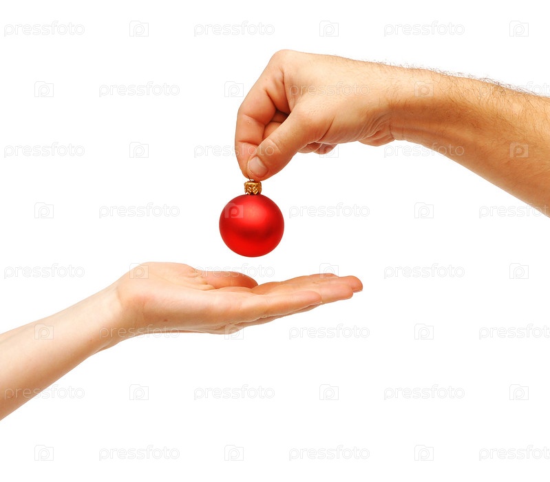 Мужская рука передающая елочную игрушку на белом фоне
