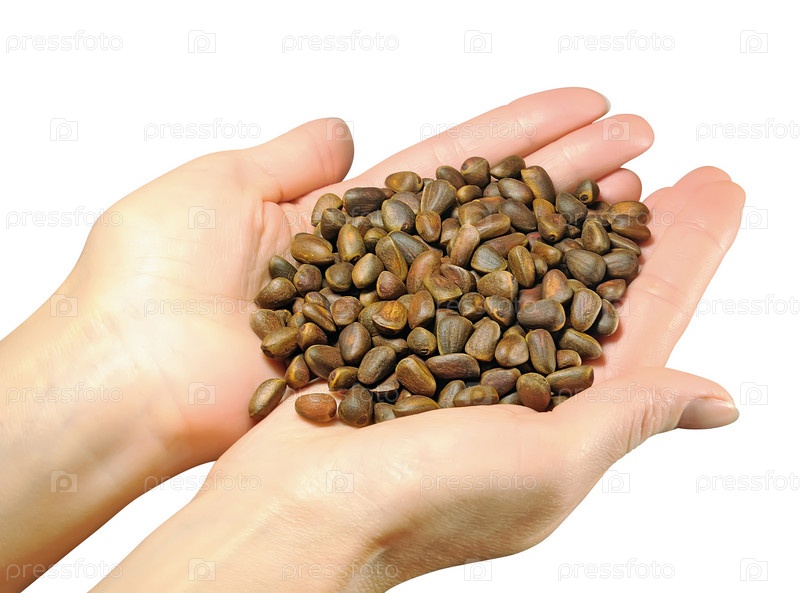 Кедровые орешки в ладонях на белом фоне