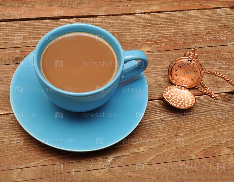 Чашка кофе и часы на фоне дерева