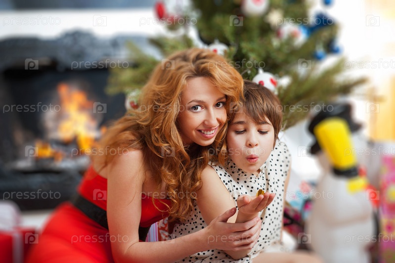 Мать и дочь сидят возле рождественской елки