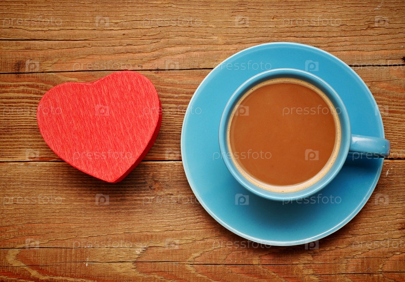 Чашка кофе и красная коробка в форме сердца на фоне дерева