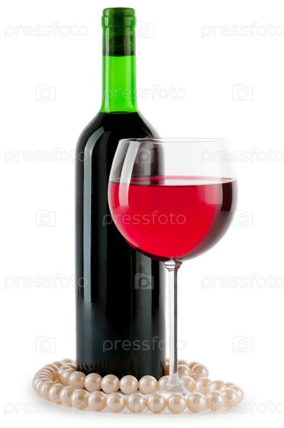 Красное вино в бокале, бутылка и нить жемчуга