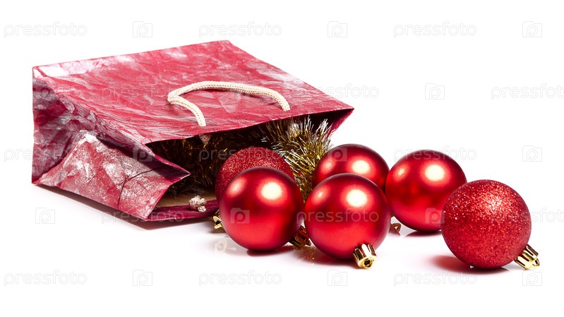 Новогодние красные шары, выкатившиеся из пакета на белом