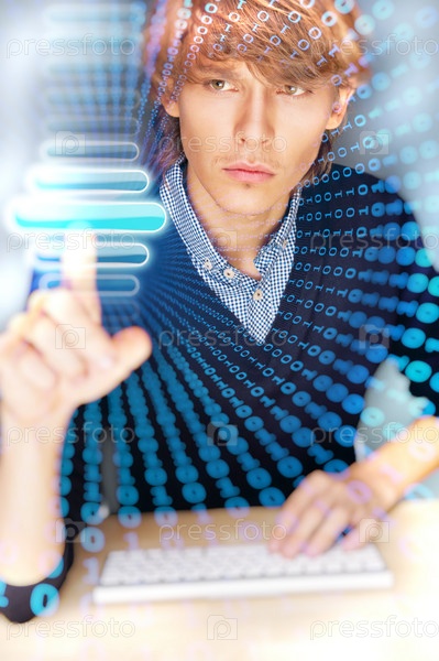 Молодой бизнесмен нажимает на виртуальную кнопку