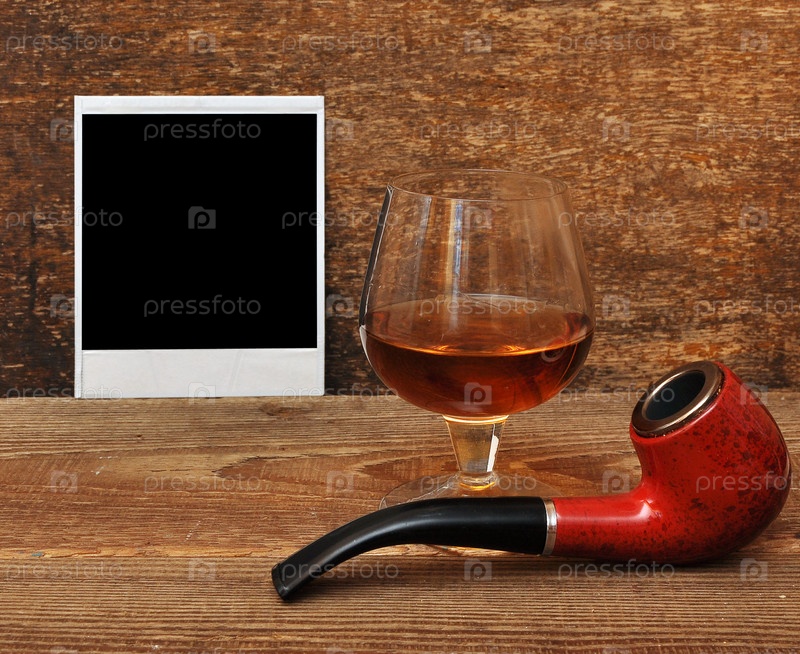 Старое фото, трубка и стакан коньяка на деревянном фоне
