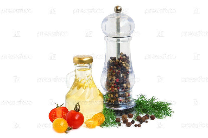 Растительное масло, перец, помидоры и зелень петрушки на белом фоне