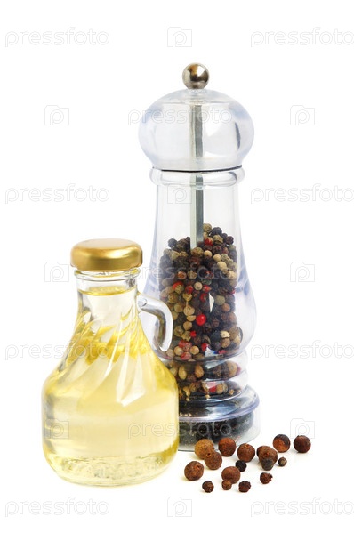 Растительное масло и перец горошком в шейкере на белом фоне