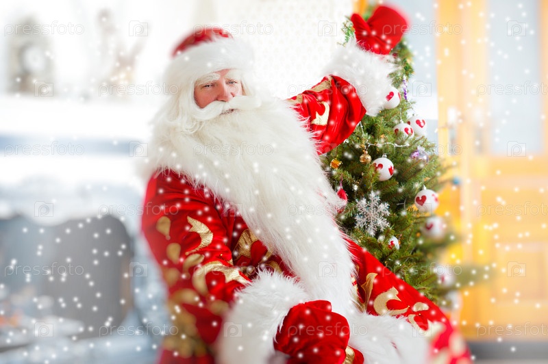 Дед Мороз в красном кафтане сидит возле елки