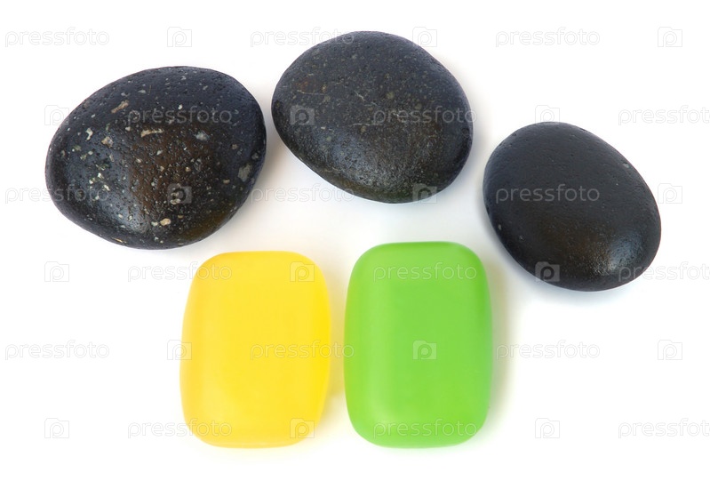 Массажные камни и два куска мыла разных цветов на белом фоне
