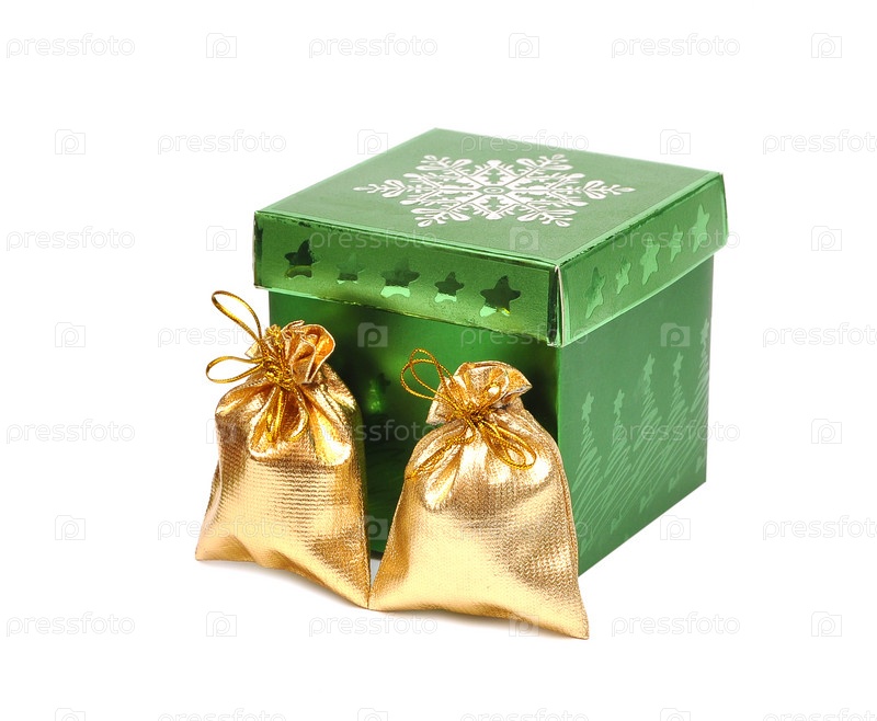 Блестящие подарочные пакетики и зеленая коробка на белом фоне