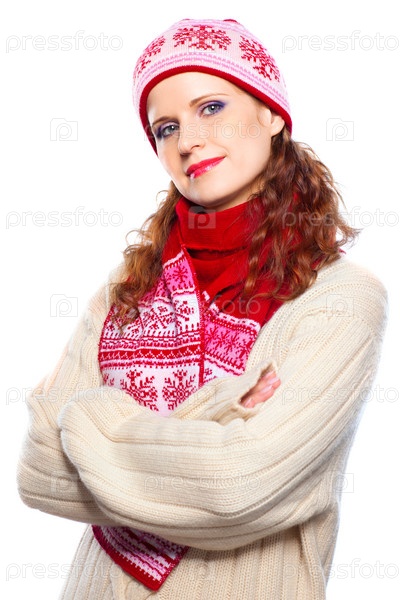 Молодая женщина в теплой одежде, изолирована на белом