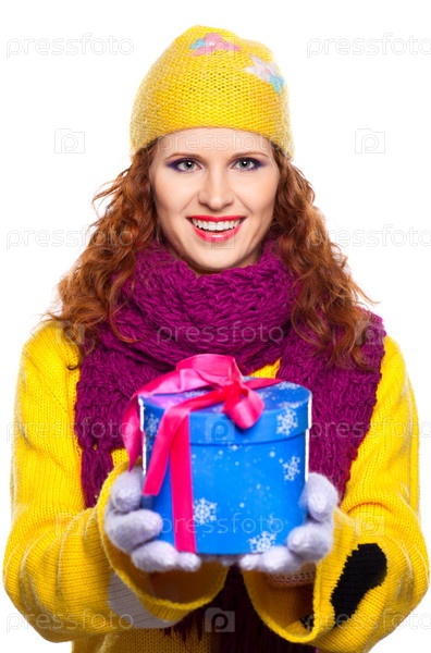 Счастливая девушка с новогодним подарком на белом фоне