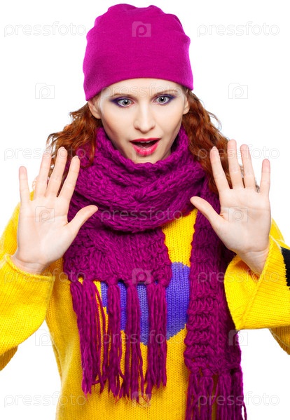 Удивленная молодая женщина в шапке и шарфе, изолирована на белом фоне