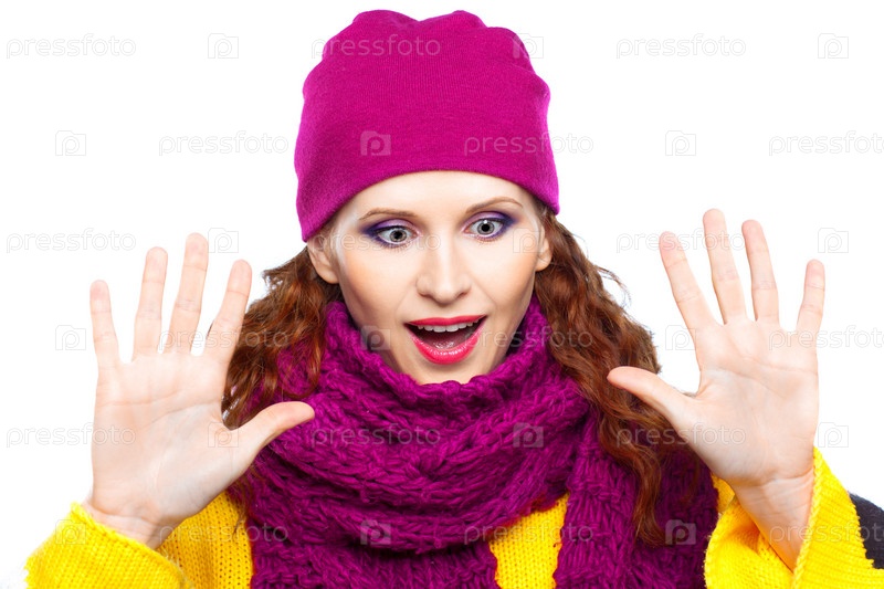 Удивленная молодая женщина в шапке и шарфе, изолирована на белом фоне