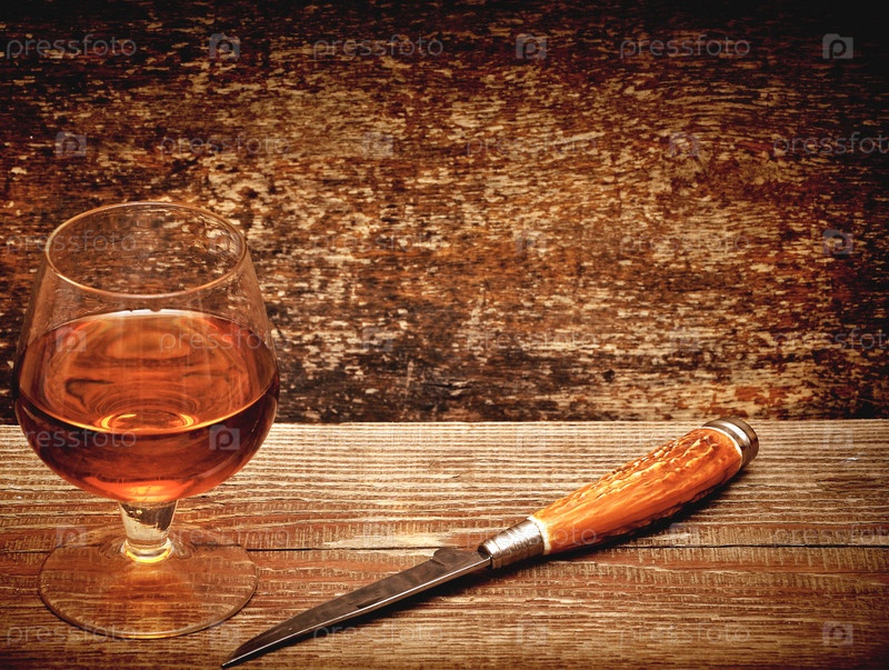 Бокал коньяка и охотничий нож на деревянной поверхности
