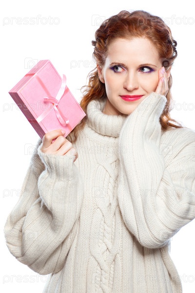Молодая женщина в кашемировом свитере с подарком, изолирована на белом фоне
