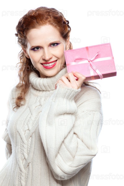 Молодая женщина в кашемировом свитере с подарком, изолирована на белом фоне