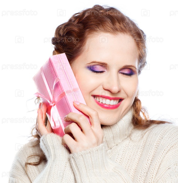 Счастливая женщина в кашемировом свитере с подарком, изолирована на белом фоне