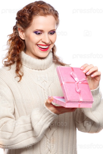 Счастливая женщина в кашемировом свитере с подарком, изолирована на белом фоне