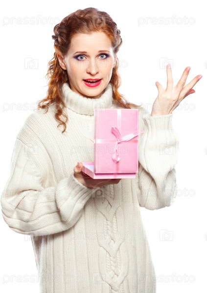 Разочарованная подарком девушка в кашемировом свитере, на белом фоне