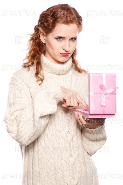 Разочарованная подарком девушка в кашемировом свитере, на белом фоне