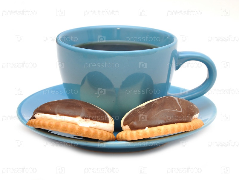 Чашка чая и печенья на белом фоне