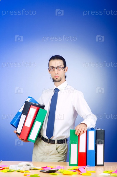 Бизнесмен со стопкой папок в офисе
