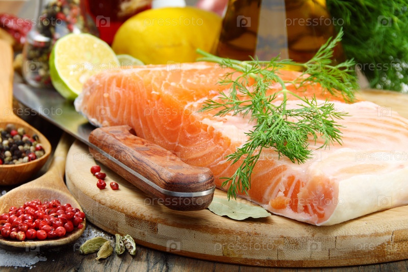 Свежее филе лосося с зеленью и специями на кухонном столе