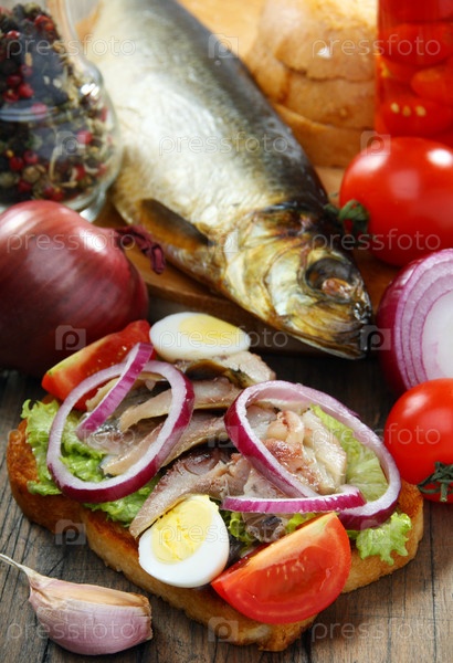 Сэндвич с копченой сельдью и овощами на деревянном столе