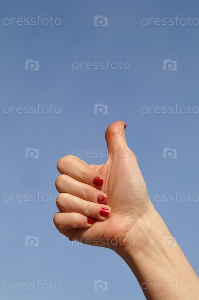 Пальцы; большой палец; рука; ногти; красный; небо; синий
