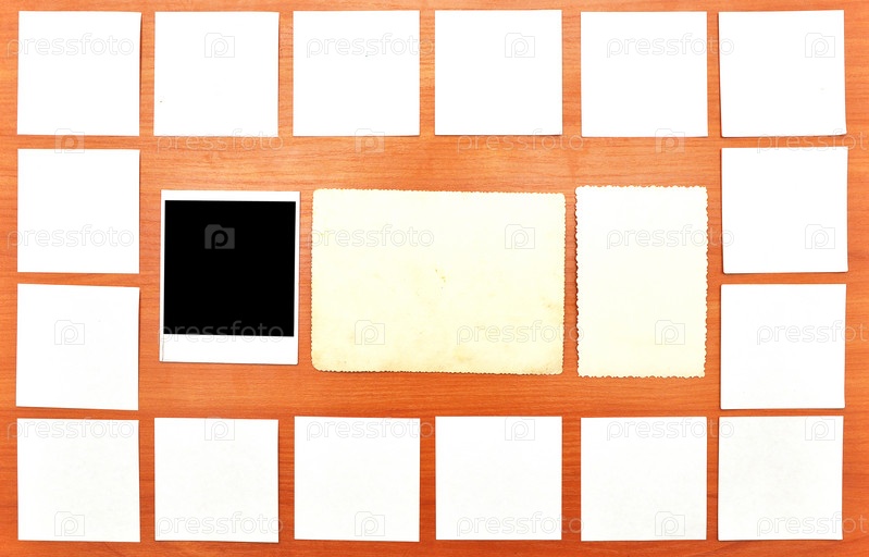 Современная моментальная фотография среди старинных фото на деревянной поверхности
