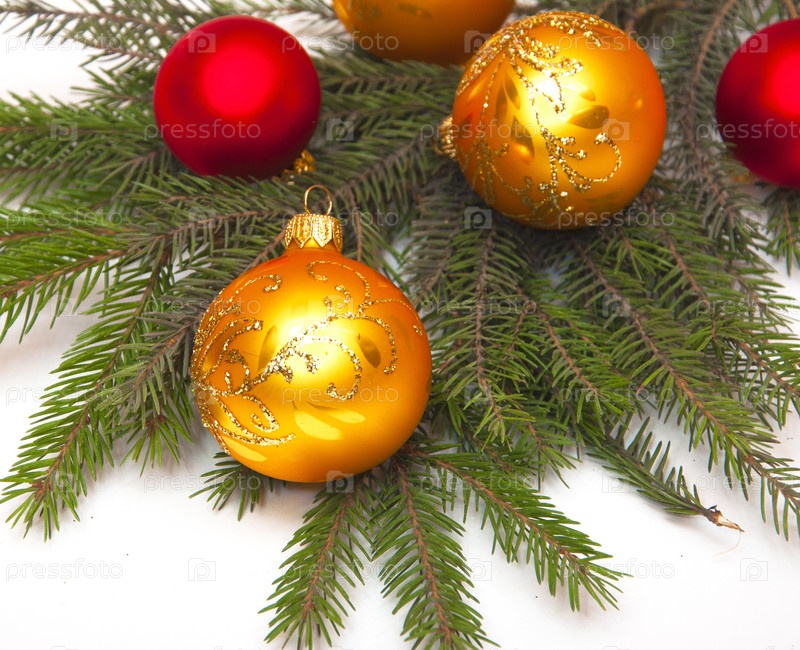 Новогодние шары на ветке ели, размещенные на белом фоне