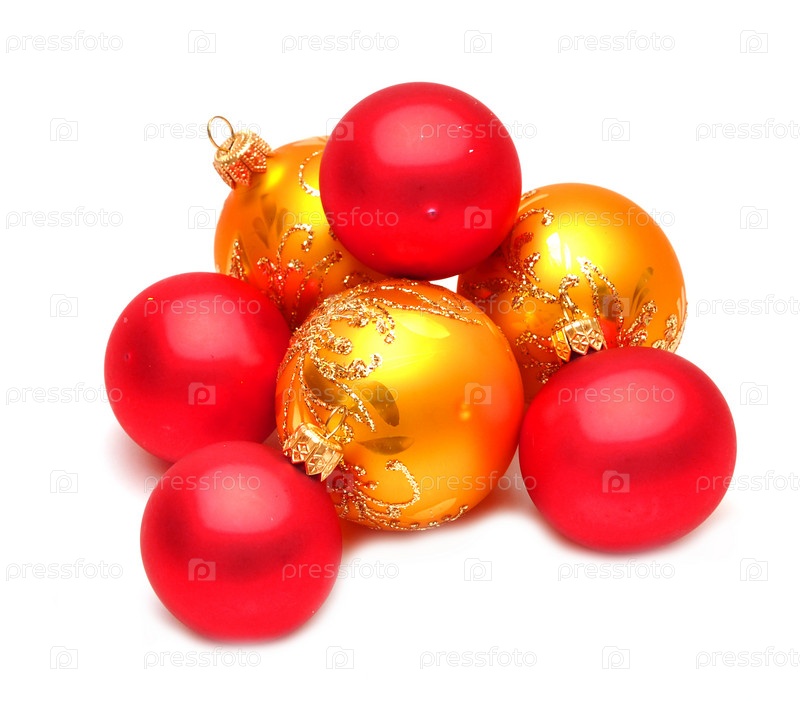 Красные и желтые новогодние шары,на белом фоне