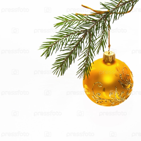 Елочная ветвь и желтый рождественский шар на белом фоне
