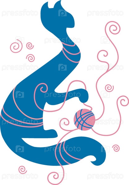 Голубая кошка играет с розовым клубком