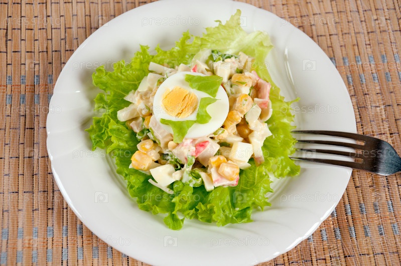 Салат с яйцом и майонезом на белой тарелке