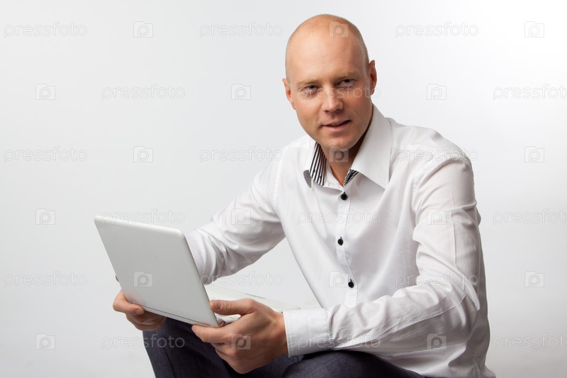 Мужчина с ноутбуком на светлом фоне