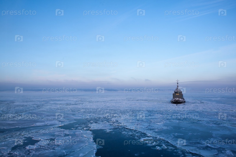 Одинокий корабль в море, затянутом льдом