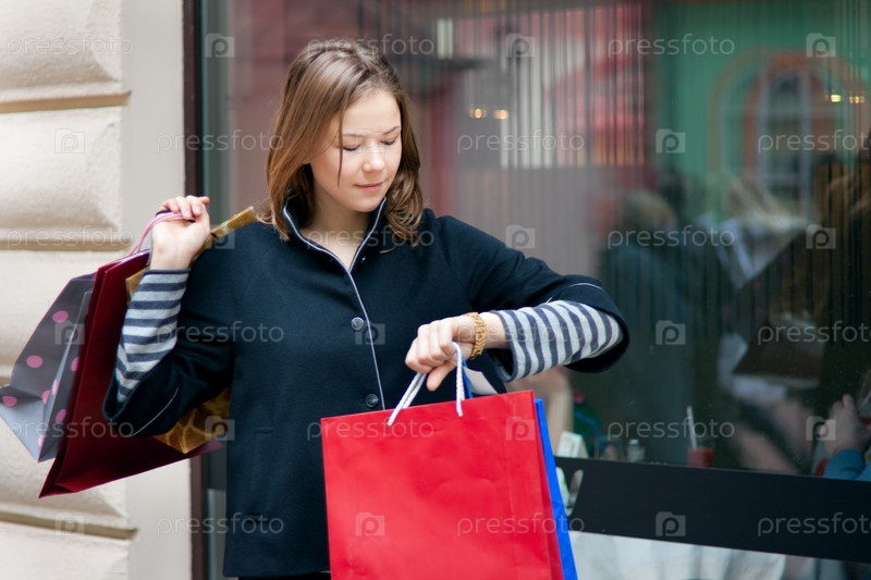 Красивая молодая женщина с сумками для покупок, смотрящая на часы