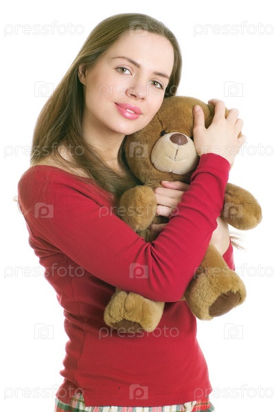 Красивая молодая девушка со своим медвежонком.Студиосъемка на белом фоне