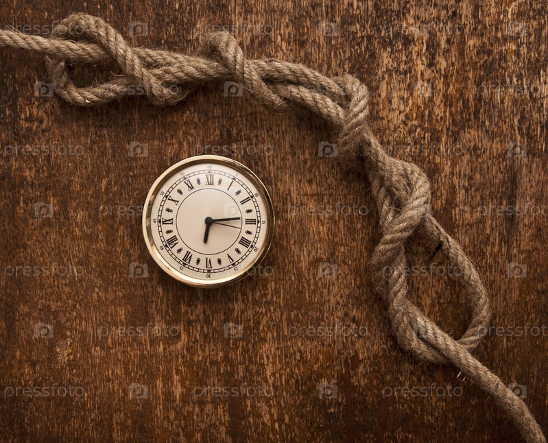 Пеньковая веревка и часы на деревянной поверхности