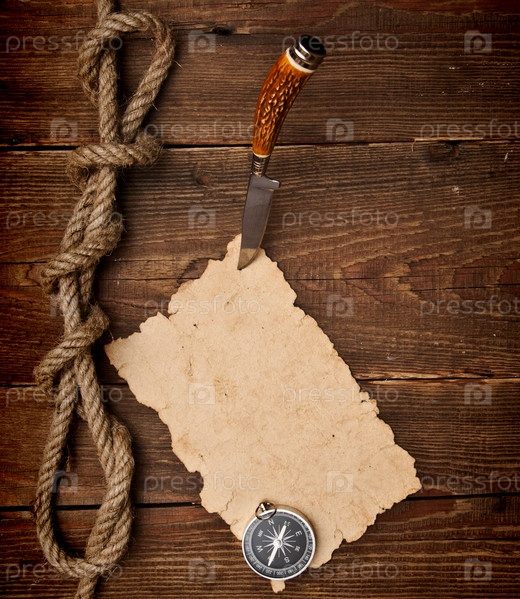 Нож, держащий старый холст, компас и пеньковая веревка
