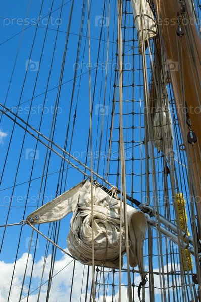 Парус и мачты старой лодки на фоне голубого неба