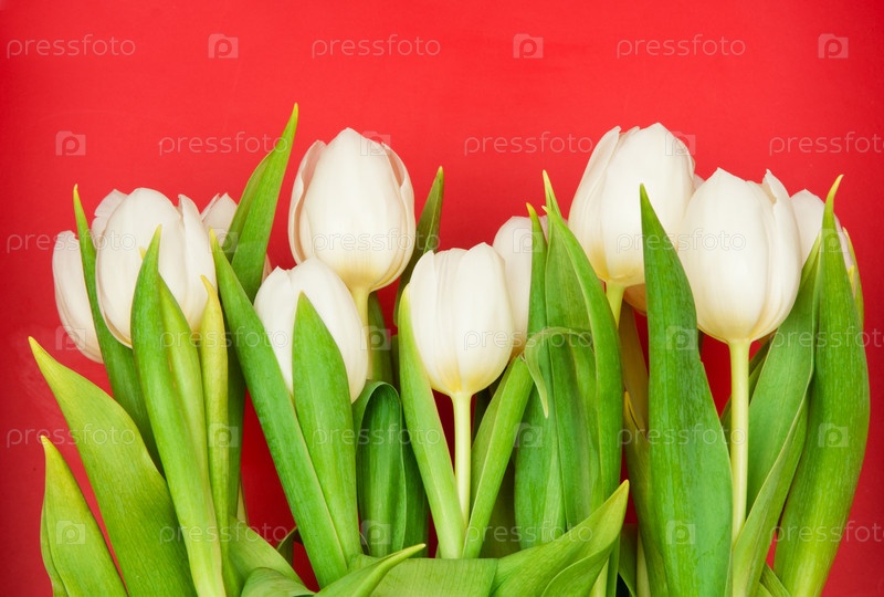 Красивые белые тюльпаны на красном
