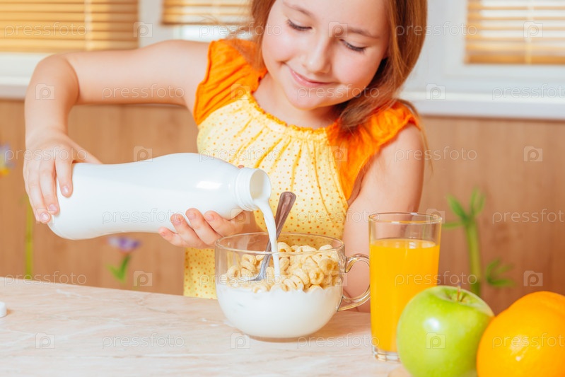 Девушка наливает молоко для здорового завтрака