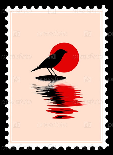 Силуэт птицы на фоне заходящего солнца, почтовая марка